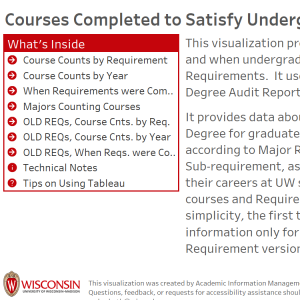 Interactive Data Visualization | This visualization provides information about how and when undergraduates completed their Major Requirements. It provides data about course counts and Time to Degree for graduates since Summer 2013, according to Major Requirement and Sub-requirement, as well as data about when in their careers at UW-Madison students completed those courses and Requirements/Sub-requirements. Additional Info |
